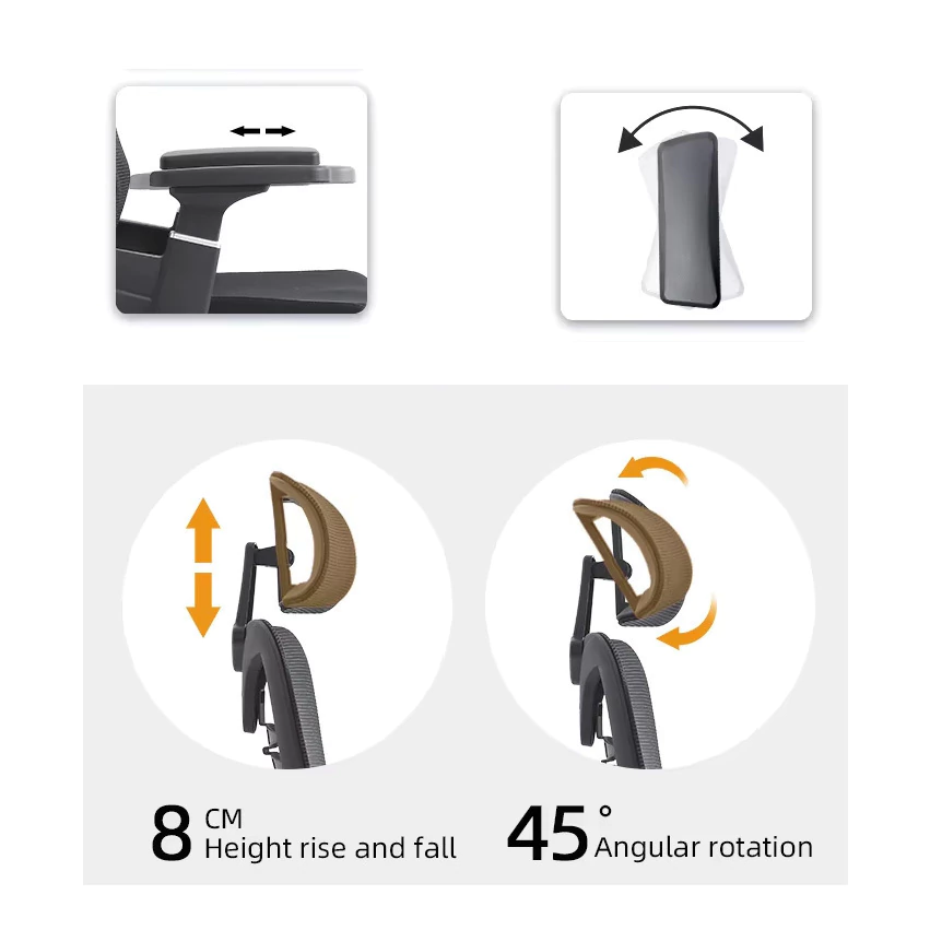 Cabecero: Con malla de alta resistencia, ajustable en altura y ángulo para un soporte óptimo de tu cuello.